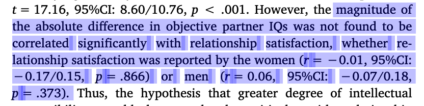 Again, this is not a direct test of the original claim, but it does suggest that relationship satisfaction is determined by factors other than the intelligence of the people involved.